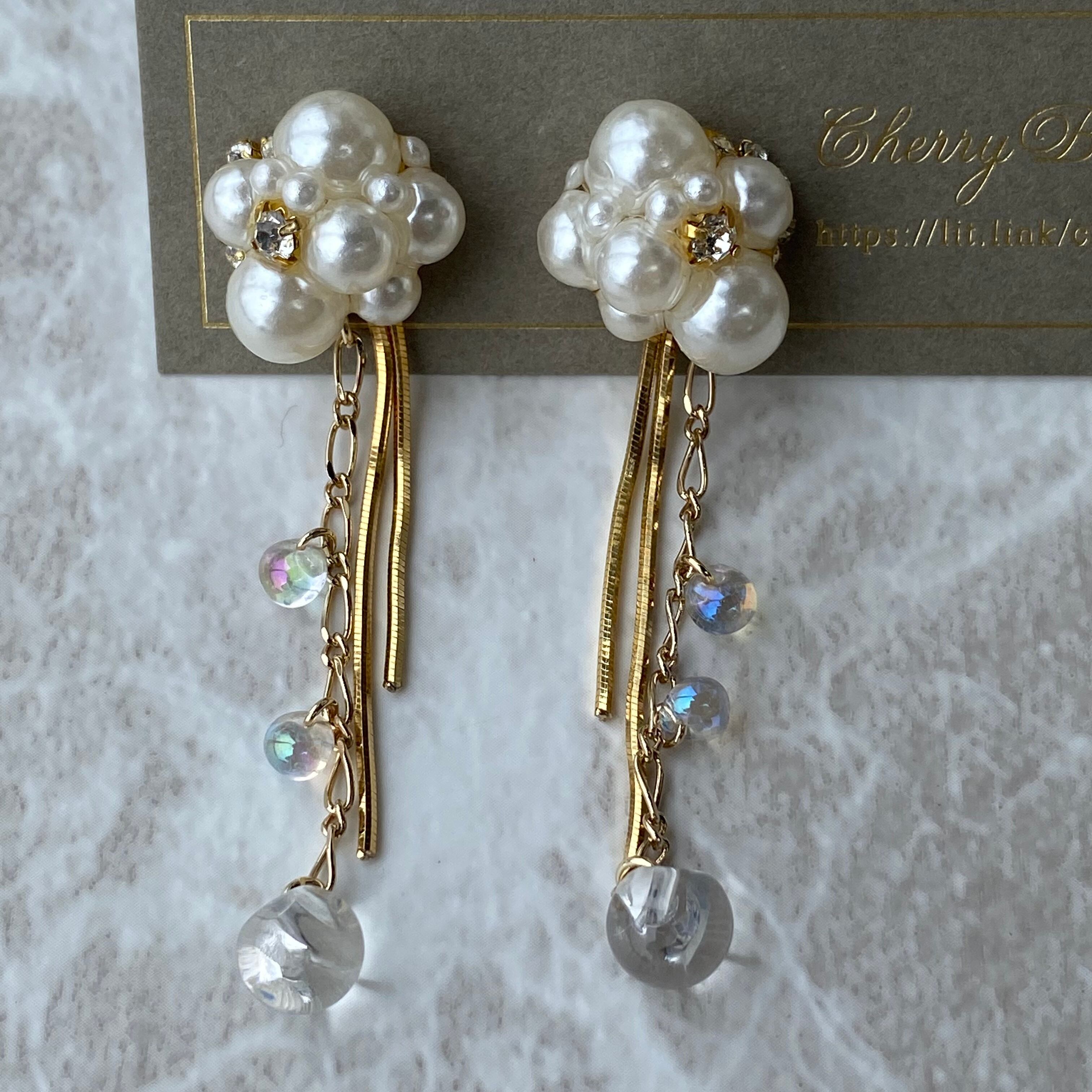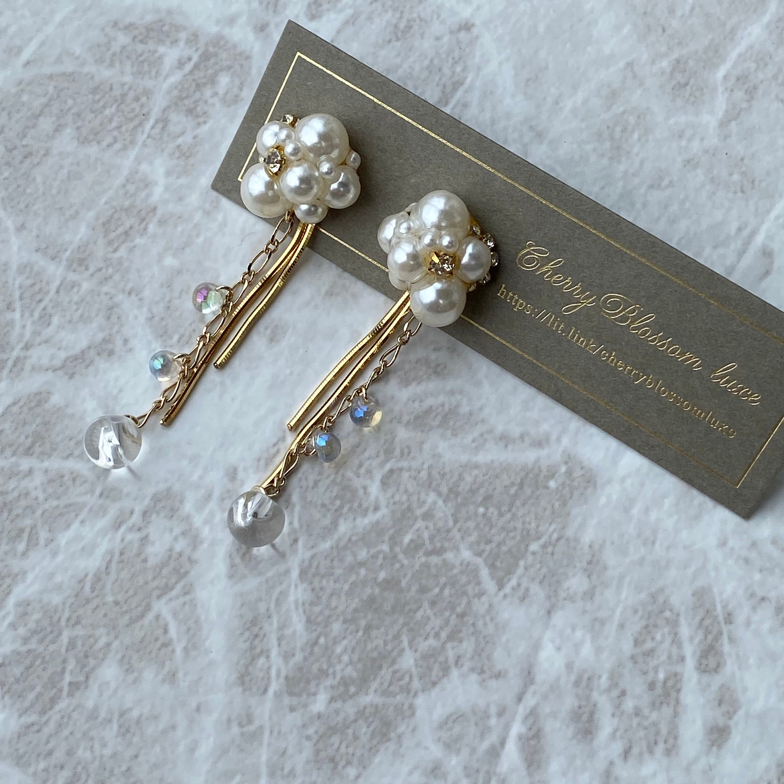 パールをふんだんに使用しクリアガラスのビジューがアクセントになっているデザイン。