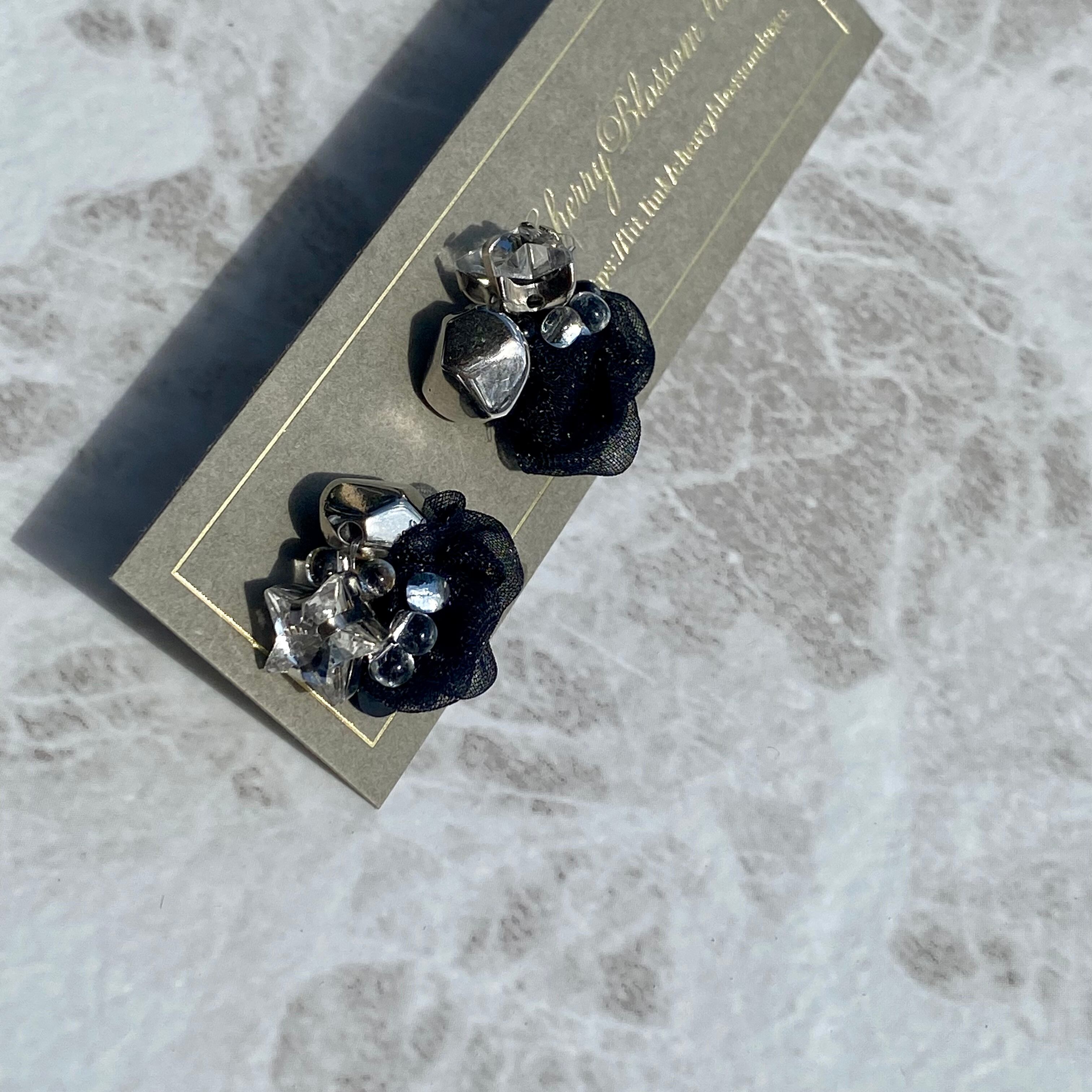 夜空の輝きアクセサリー(星 スター シルバー オーガンジー 軽いピアス イヤリング アレルギー対応 小振アクセサリー お呼ばれアクセサリー 大人可愛い カジュアル 黒)