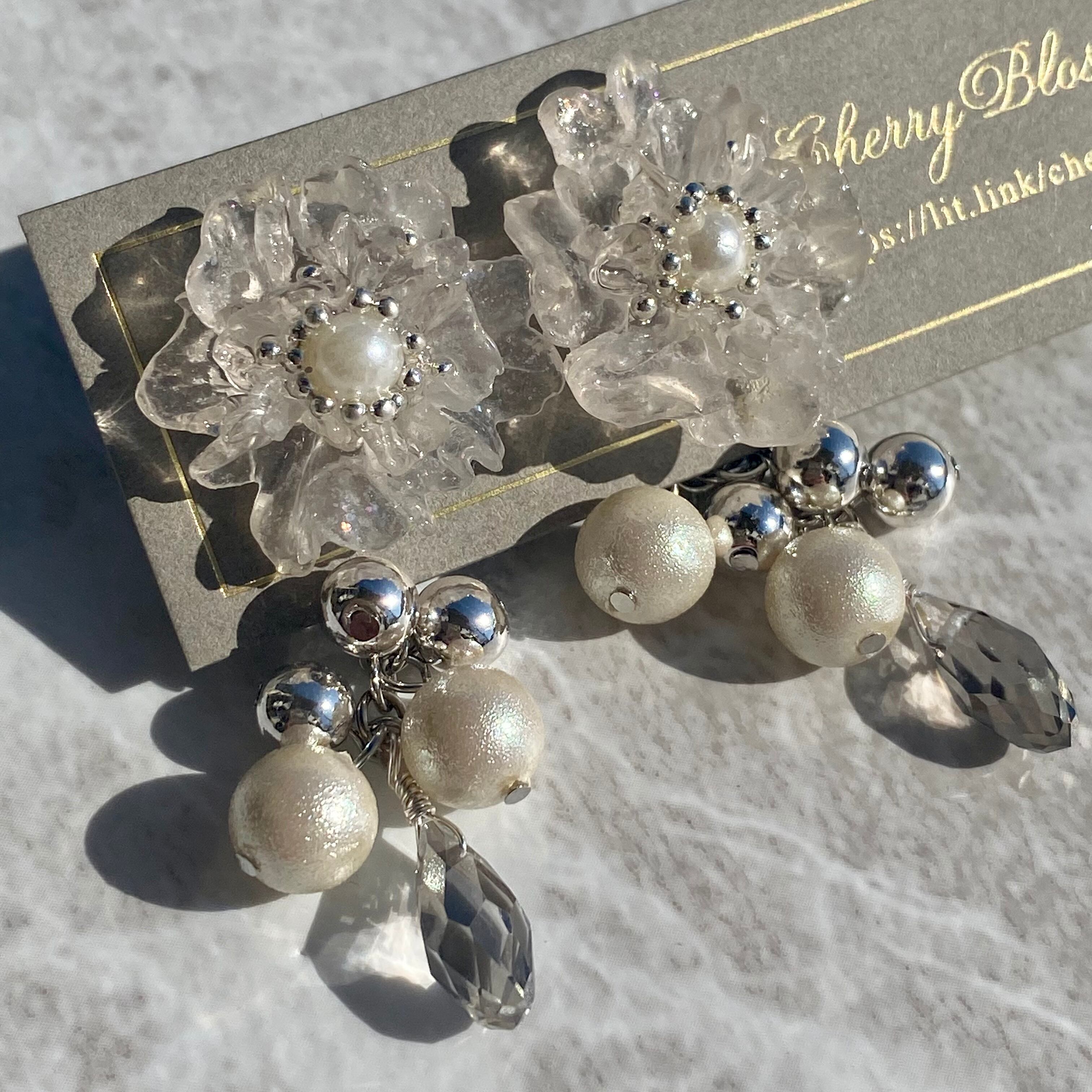 程よい甘さのフラワーアクセサリー(花 シルバー 透明 春 サージカルステンレス アレルギー対応 女子会 ウエディング 結婚式 フラワー 雫 大人女子 お呼ばれアクセ)