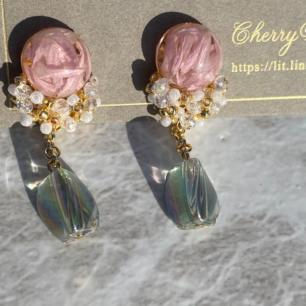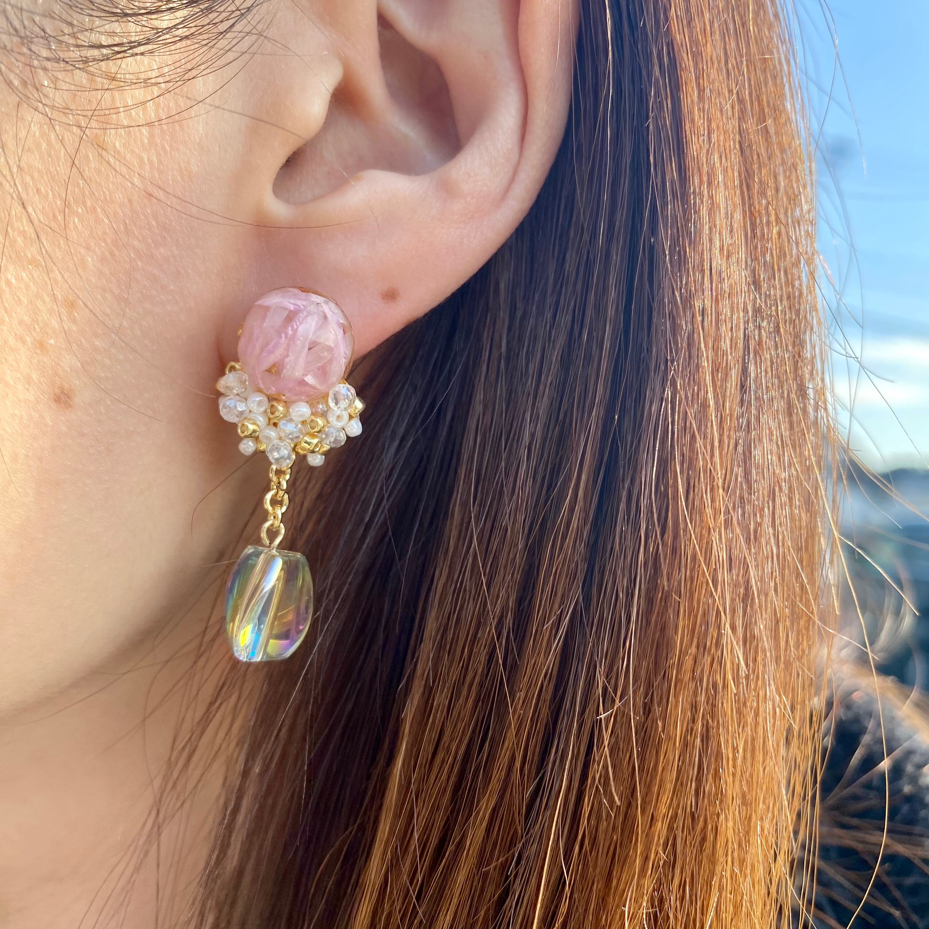 ピンクの花びらをたっぷりと詰め込んだ淡い色合いのお姫様アクセサリー(ピンク 桃色 ピアス イヤリング アレルギー対応 お呼ばれ 女子会 大人女子 オーロラ 可愛い)